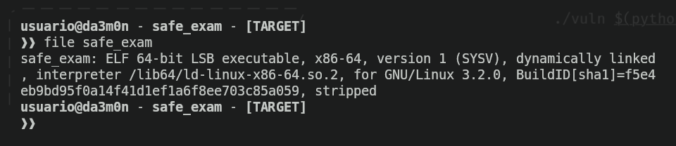 As we can see, it's an executable file, (nothing surprising seeing we executed the application before). It's in ELF file format. I knew the script was written in Python because the own repository our professor told us to download the binary from tells it.