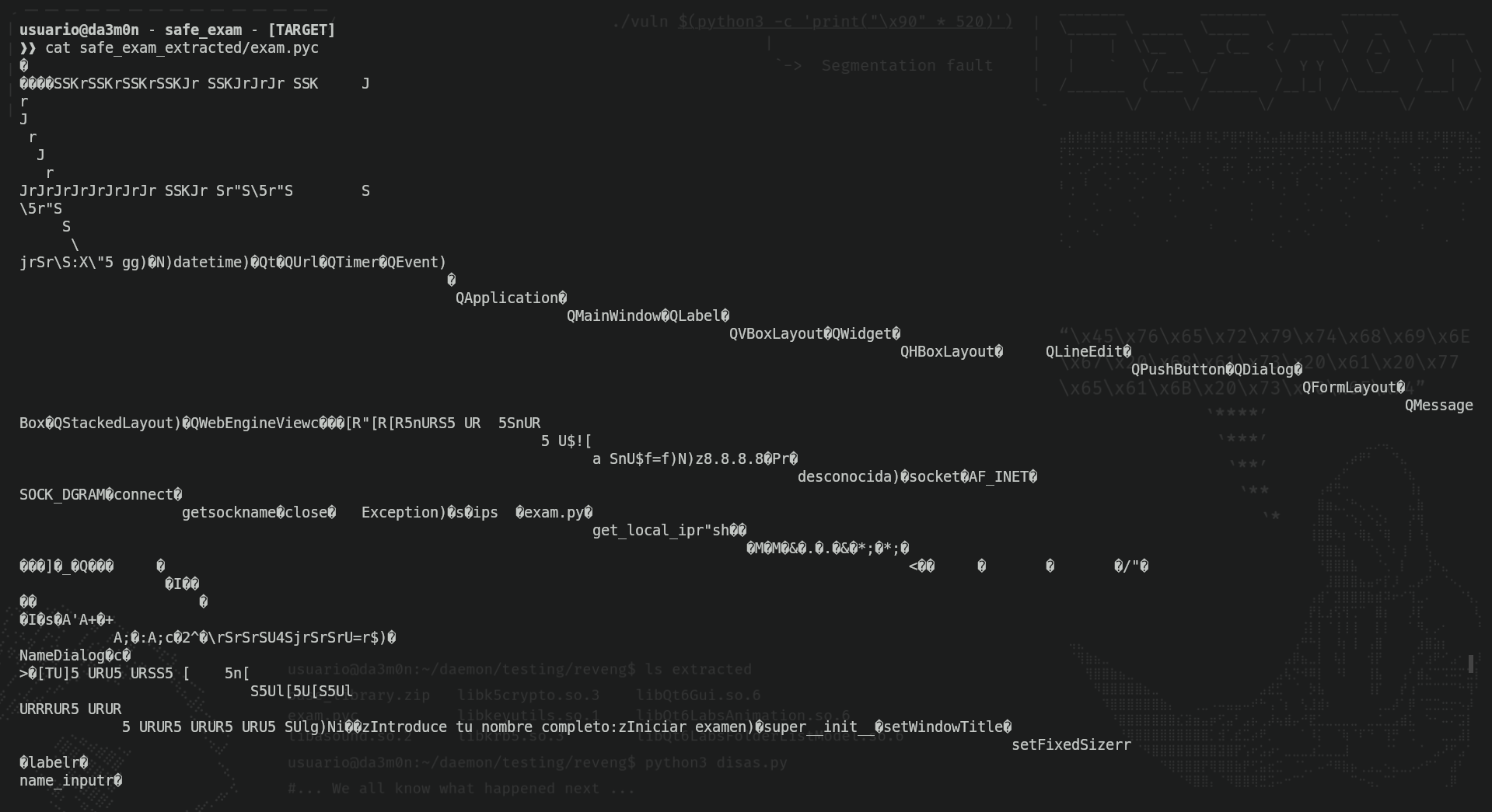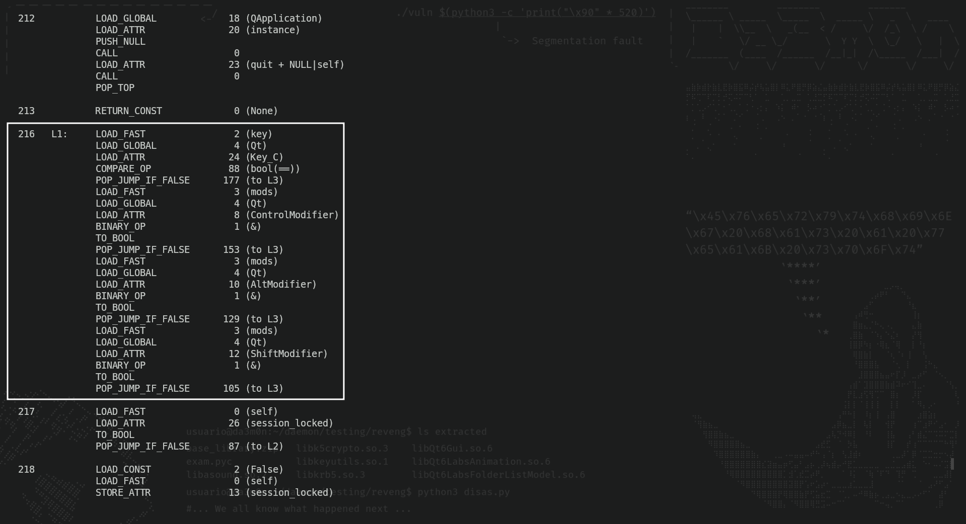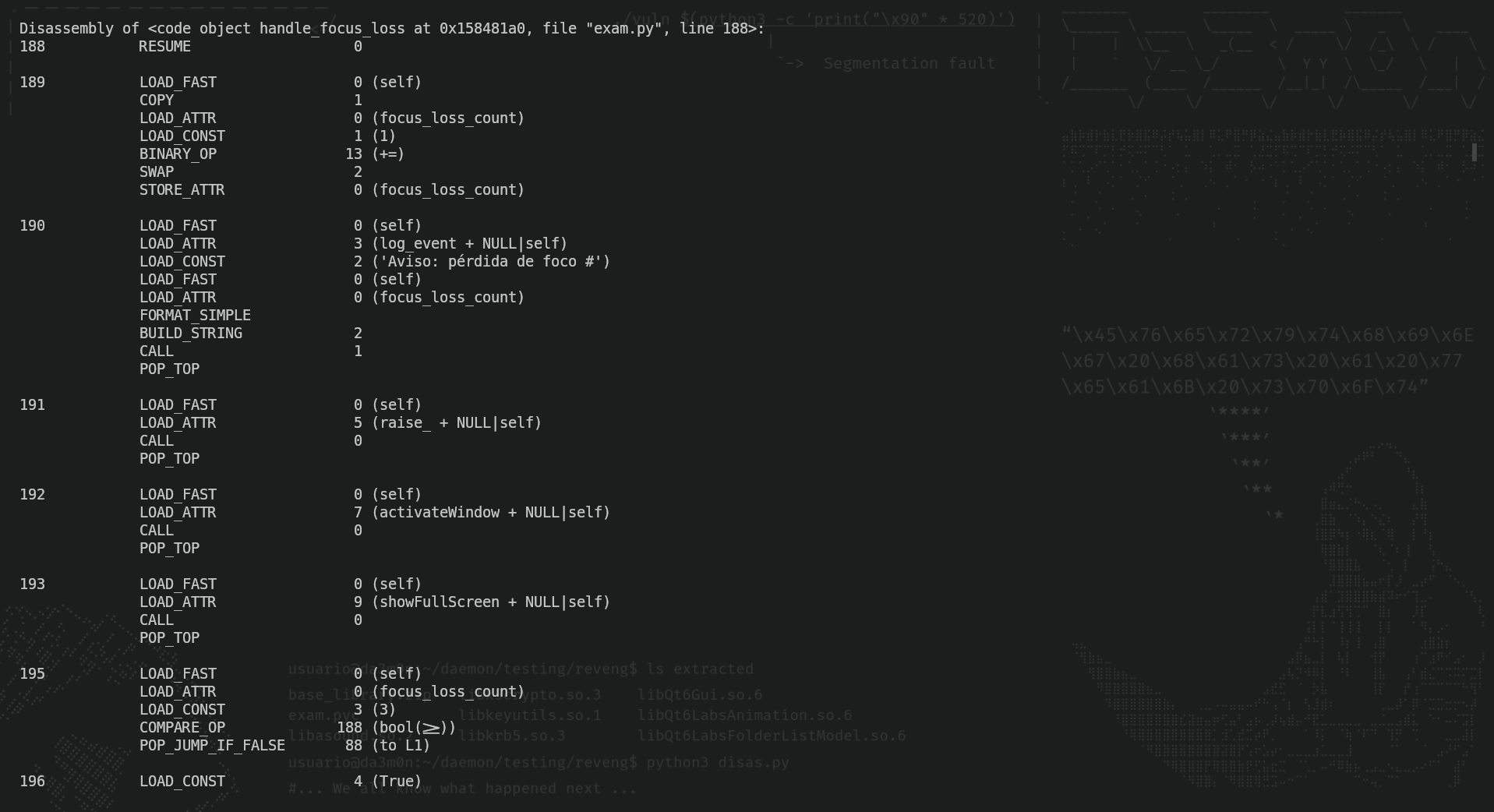 ./decompilex.py safe_exam_extracted/exam.pyc This allowed me to review the pseudo-assembly code. In order for you to see how it looks like, this is an example screenshot of the disassembled exam.pyc file: