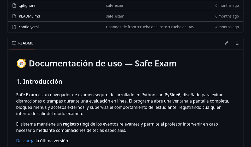 The application is called "safe_exam" and it is used to control the screens of the user and force the webpage to cover all the screen, blocking it and preventing the user to change windows or tabs locking all other applications, forcing the navigator tab to cover all other apps. Furthermore, it prevents you from searching anything because it deletes the search bar from the window and only let you see the webpage where we do the exams.