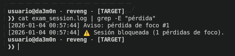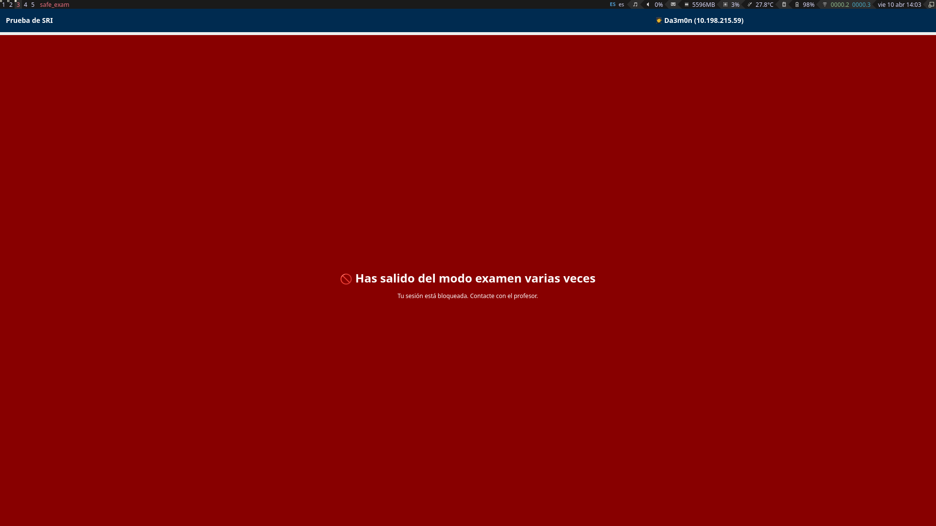 So if I open the application in the workspace "1" and then change to the workspace "2" pressing "Super" (Windows key) + "2", and come back to the workspace "1" pressing "Super" + "1". I can interact freely with my terminal in the workspace "2" because the exam app is running in workspace "1". However, changing a workspace means losing the focus on the exam application, which blocks the program, and prevents me from continuing the exam. Here's how it looks like when the screen got locked when I try to change workspaces to come backg to the application (though it says in spanish I left the "exam mode" many times, I just changed the focus once and it got blocked).