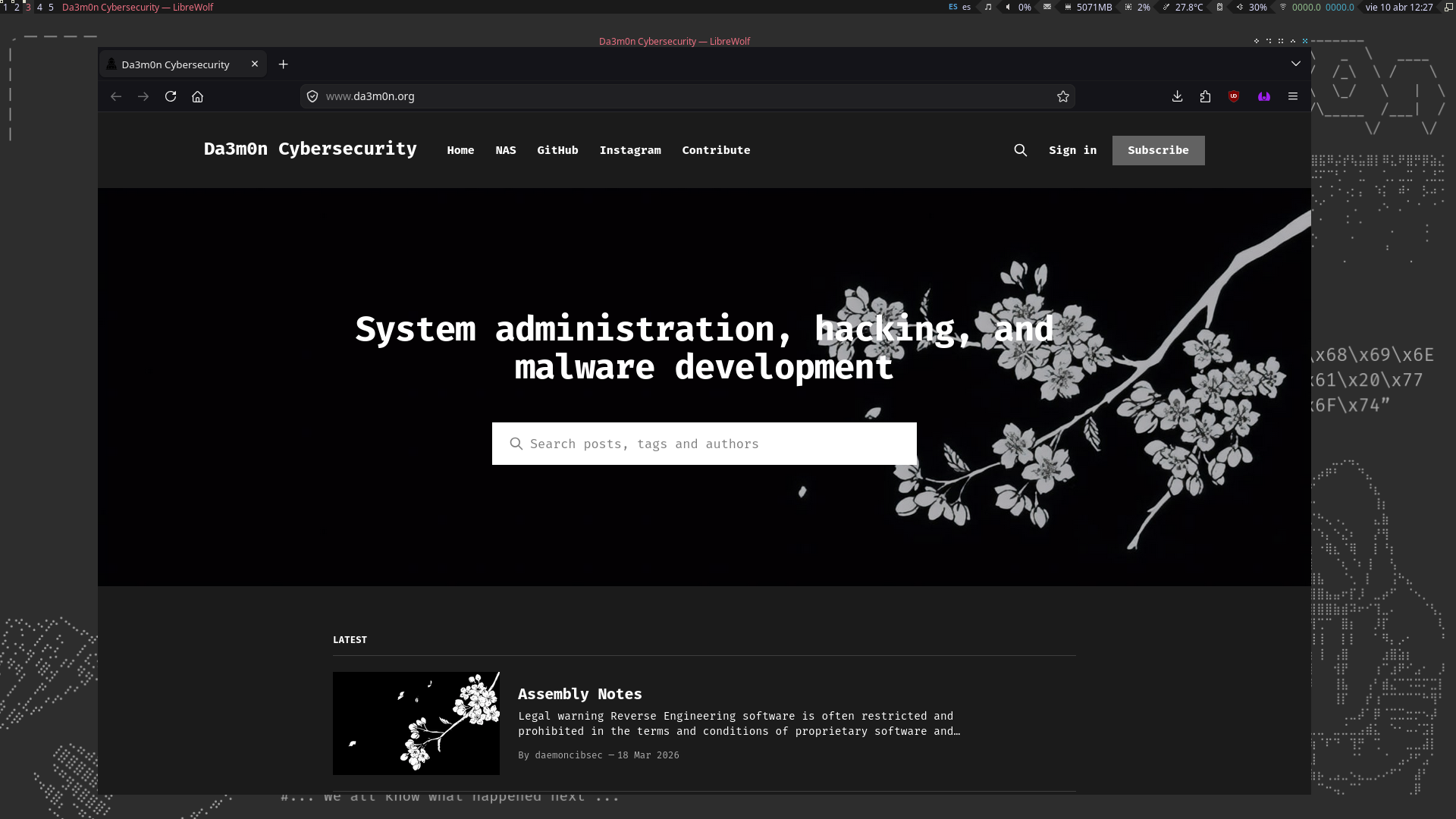 The the image in the background is the wallpaper of my Window Manager, on the top part, I have the widgets to take a fast look at the information I need to know about my PC, for example, the date, the MB of memory consumed, the CPU usage percentage, the volume, the battery charge, etc.