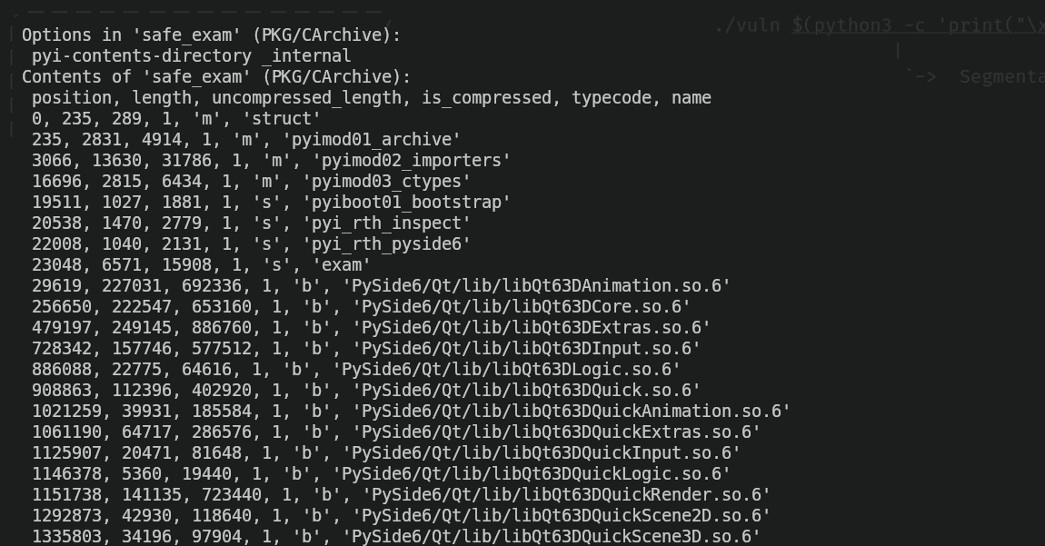 pyi-archive_viewer -l ./safe_exam | lessAnd it gave me the following output.