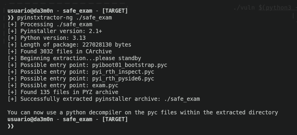 The 's' indicates it is a script, and having the name 'exam' which can indicate it is the main script. Indeed, I was right. Why do I say this? Because I used this other tool called pyinstxtractor-ng to extract the contexts of the binary and be able to check them.