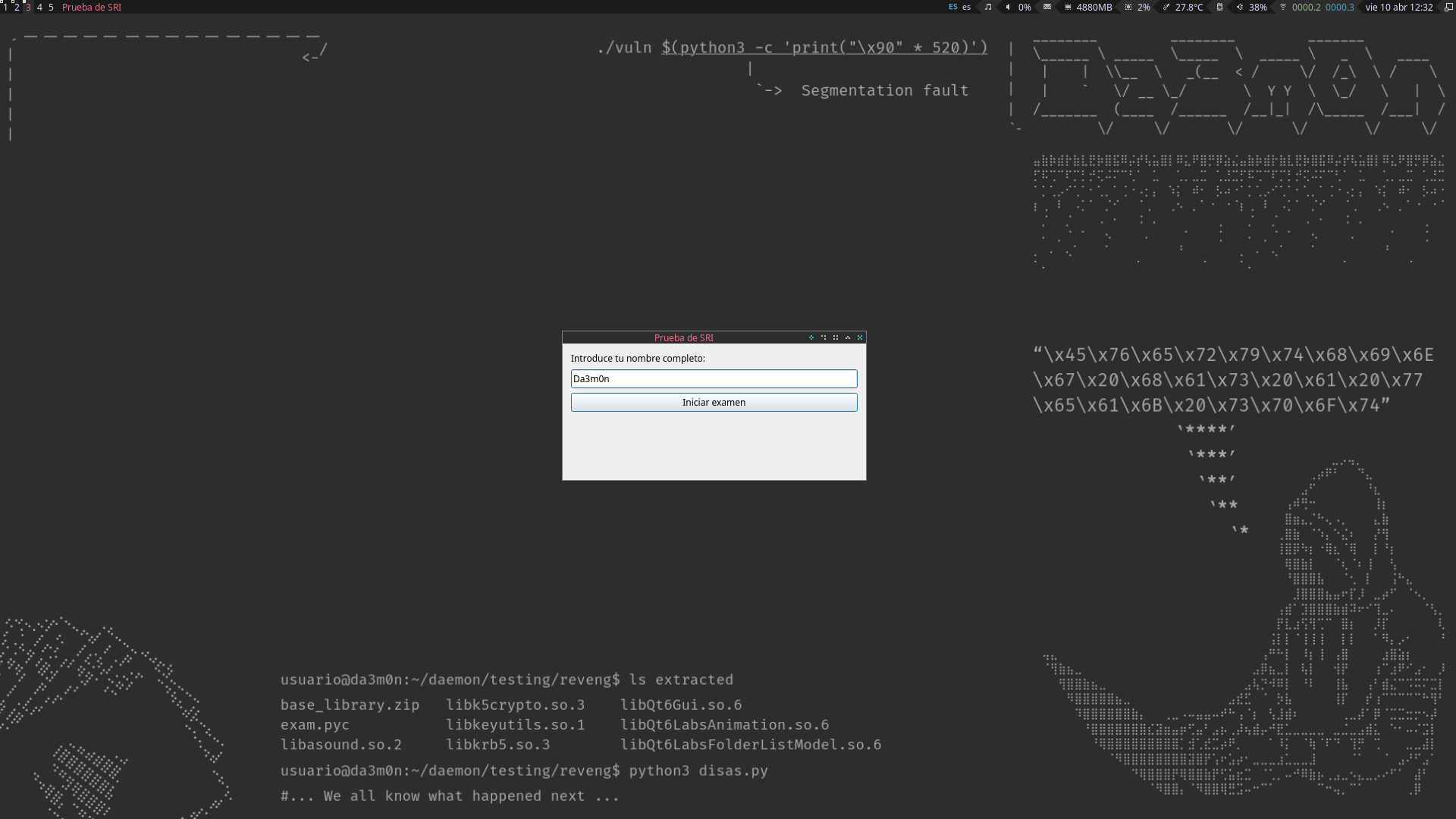 It asks you to input your name before beginning the exam. This is done because after analysing the application's execution, I realised the app generates logs the professor can recover to check what each person has done across the exam (for example, if someone started the exam, finished or cheated). The professor, who has access to all of the computers of the classroom, can connect to our computers using the SSH protocol or even download the logs directly using the "scp" command, which for those who don't know, is used to transfer files across the network using an encrypted communication.