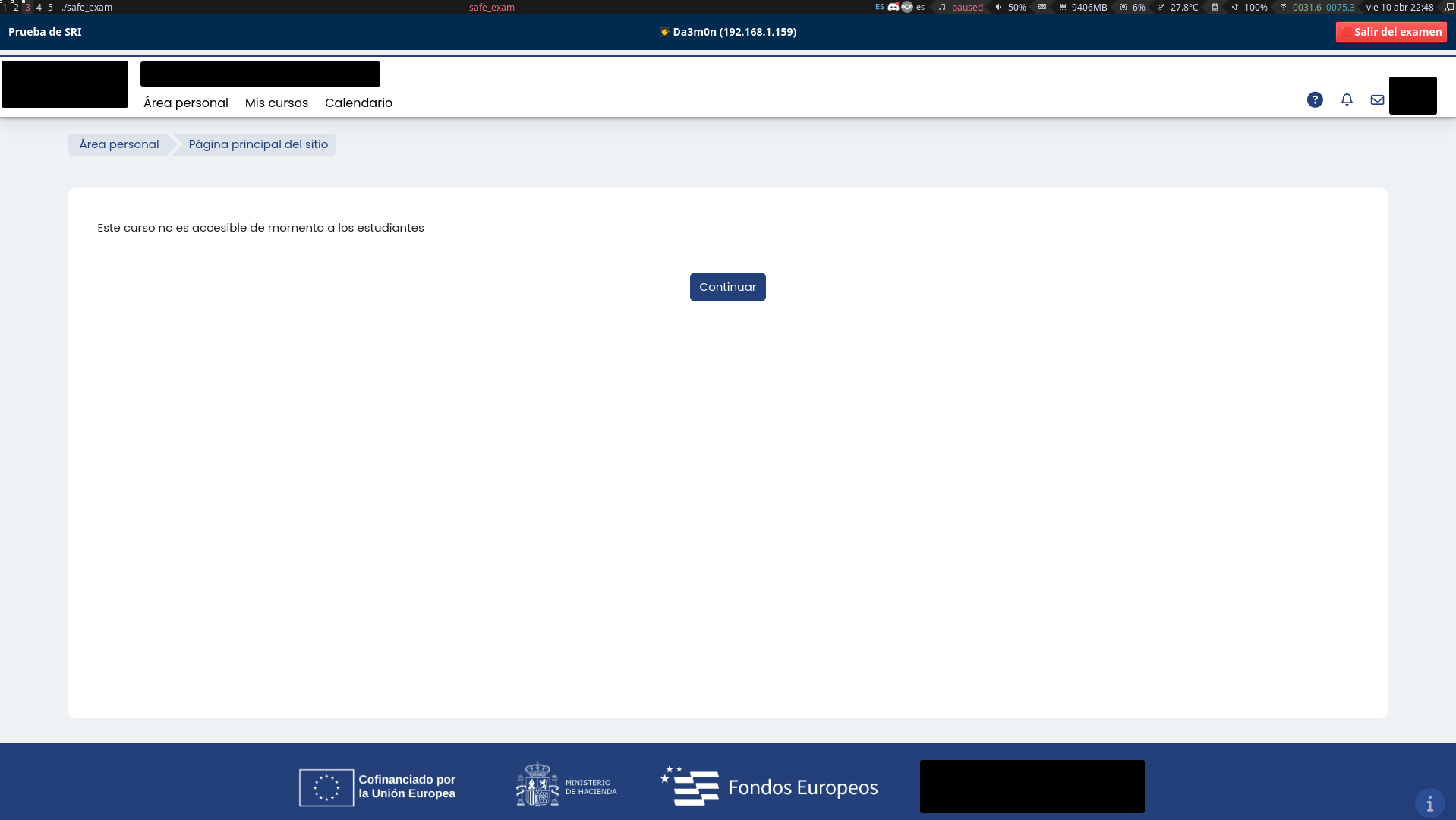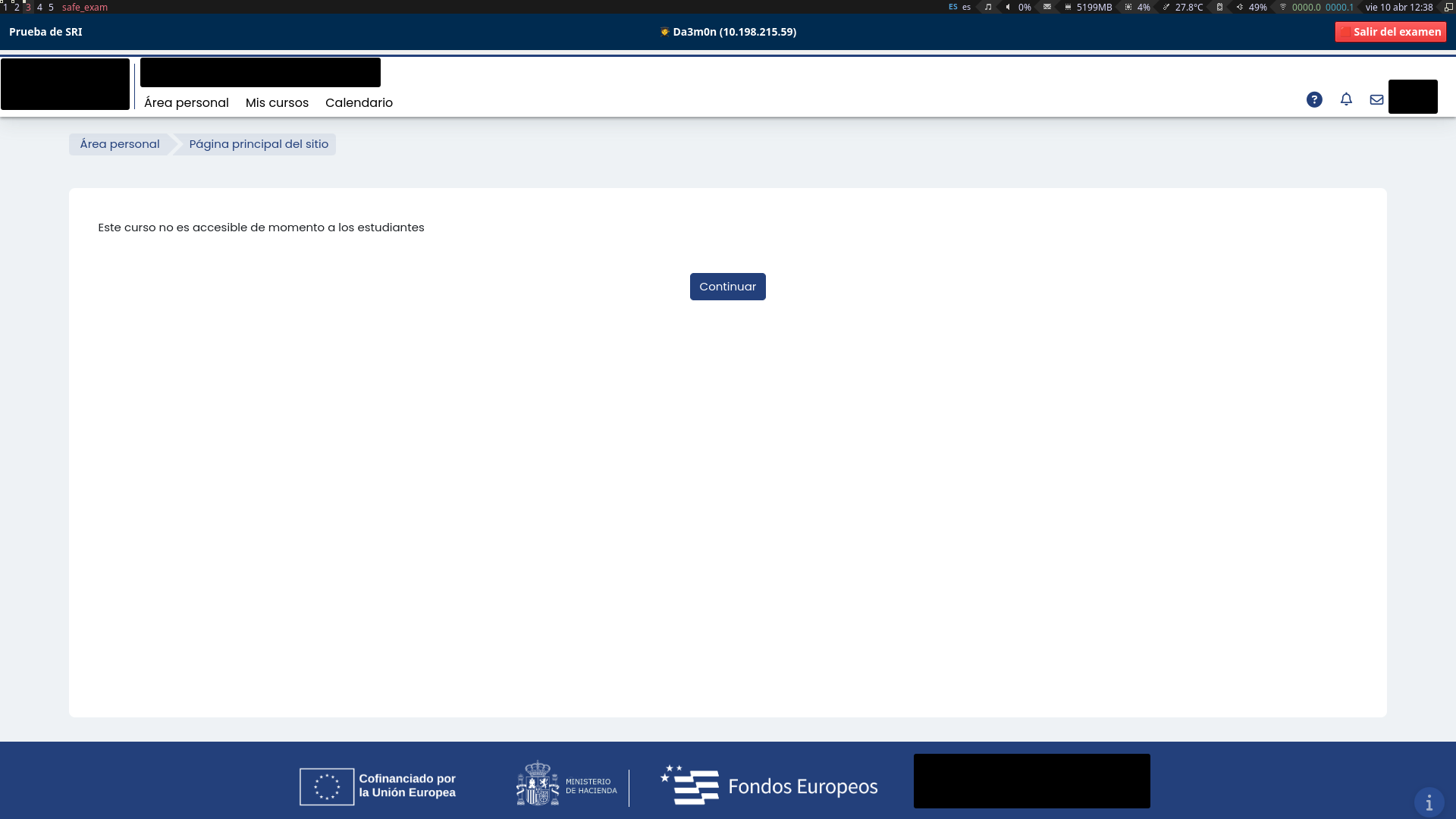 After pressing the "Iniciar examen" button (which translates to "Start Exam", it's in Spanish because I'm from Spain), I get sent to the exam webpage, which is then displayed in a window created by the application that autoscalates to your screen resolution. In this case, I can't access the exam because I've already done it (and I passed it), but it would show a series of questions I'd have to answer. This is how it looks like.
