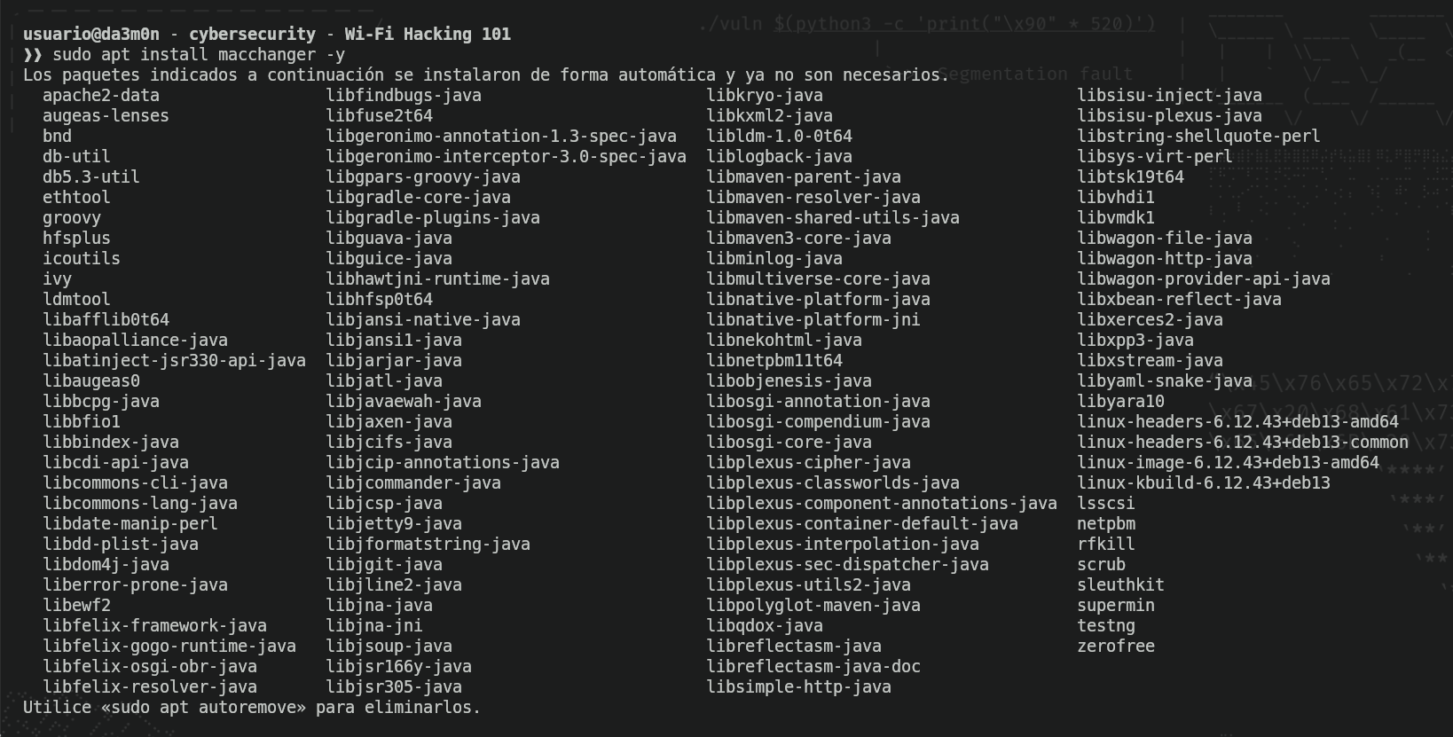 First of all, we're going to install "macchanger", which is a tool that will allow us to cover our steps once we're done doing the attack. Always remember hacking is not only about exploiting a vulnerability, is also about being untraceable. This is the minimum security measure we can do to protect ourself from being caught red-handed. Changing our MAC address is the equivalent of wearing a mask. It will cover our identity at a hardware-level so that the packets we send will be unidentifiable (at least, when the attack is done and we've already turned off our laptop). To install "macchanger", we'll use the "apt" command (which stands for "Advande Packet Tool", theackage management tool of Debian and Debian-based distributions such as the well-known Kali-Linux or Parrot OS). The command below is the necessary to install "macchanger".