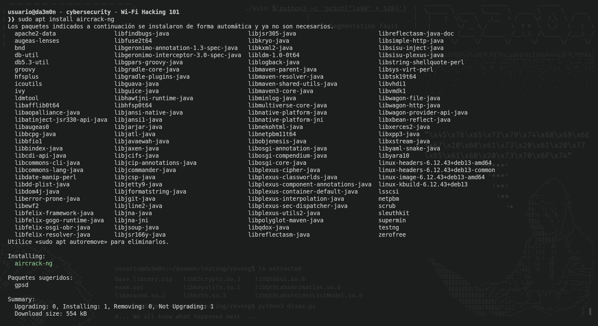 Now, we're going to install "aircrack-ng", which as mentioned earlier, is a suite of hacking tools that allows the hacker to perform various actions on other Wi-Fi access points or clients, such as deauthenticating clients from a network (which we will talk about later on because it is really important). For now, we just want it to be able to set our interface to a special mode that will allow us to gather all the traffic that we detect in our connection radious (whenever I say "radious", I'm talking about the area my laptop is able to detect access points and packets going through the air). As we did before, the following command will allow us to install all the "aircrack-ng" suite.
