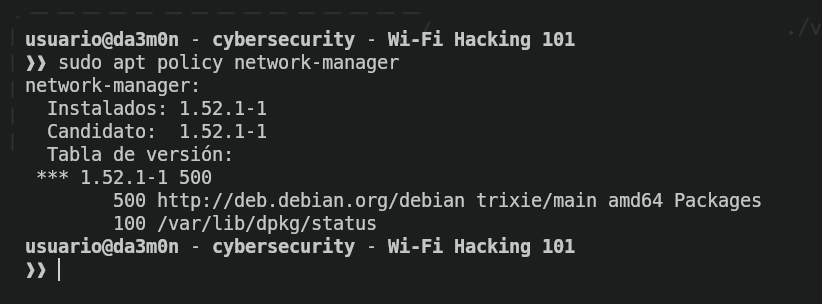 Next we'll check if network-manager is installed in our system. For that, we'll use (again) "apt", but this time we'll use the argument "policy" to know if we have any version installed (and therefore, we have the program installed).