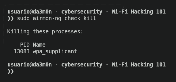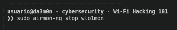 In order to start our monitor interface, we'll first stop the processes regarding the wireless connection, since we'll need to stop the network services to enable the monitor mode. We can do that with this command:
