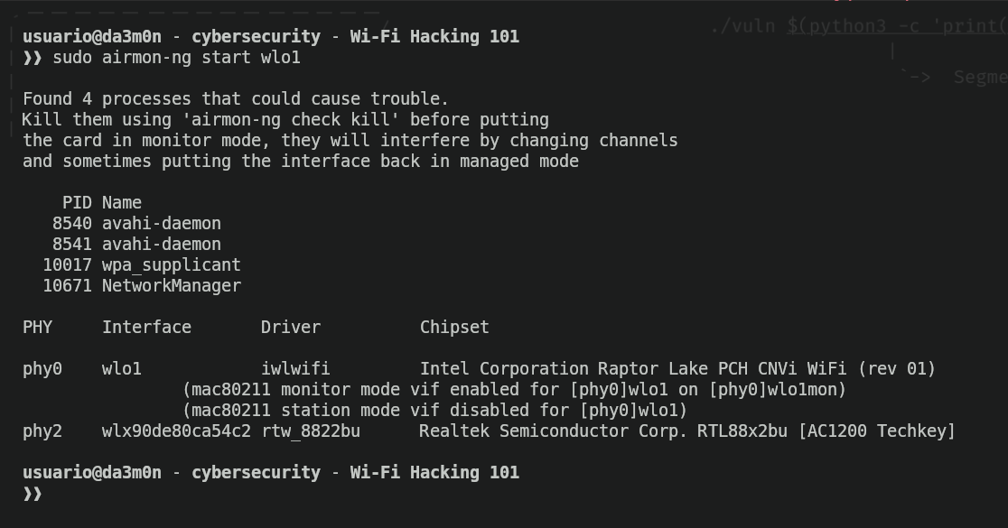 In the image above, the own airmon-ng found yet another 4 processes regarding wireless connection, so it automatically shut them down. Apart from that, he detected two physical network interfaces such as "wlo1" (which is the one we'll use) and "wlx90de80ca54c2", which also is a USB network adapter I bought long ago. This one was connected for testing purposes, but it's only necessary 1 physical network interface that allows wireless connections. After that, the name of the network interface we've chosen will be "original name" + "mon", so if I selected in this example "wlo1", the network interface name in monitor mode is "wlo1mon". This is the name we'll use from now on in our network interface.