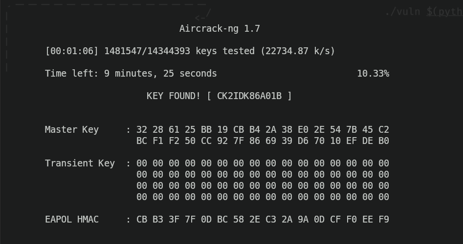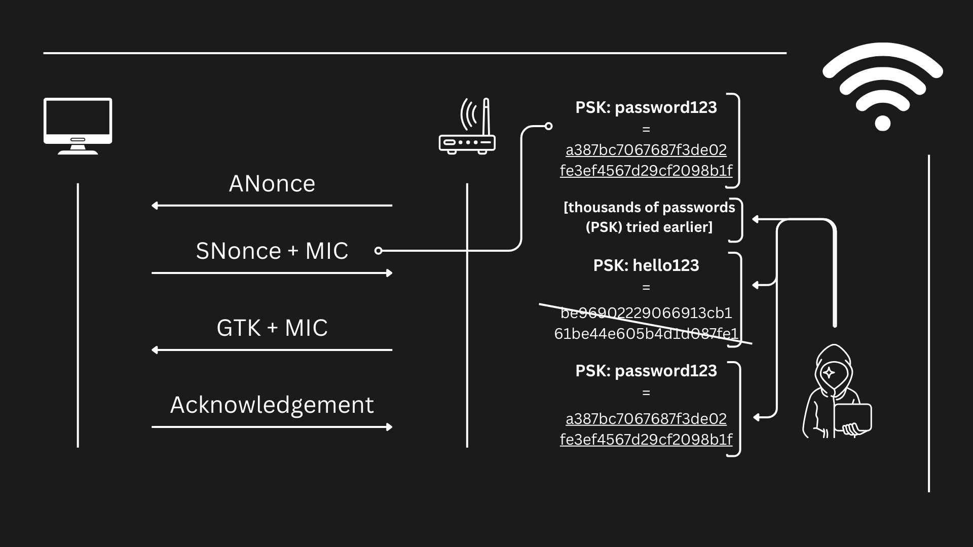 - When finally the replication succeeds and the MIC the hacker generated trying different passwords as PSK matched the original MIC gathered from the handshake, the hacker now knows the password used originally.