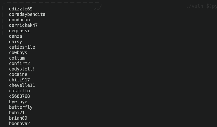 However, what's exactly a wordlist? A wordlist is a (really large) collection of passwords stored in one file. We must use the wordlist to perform the cracking attempt for obvious reasons, since trying one password each after another, would be really slow. Don't get me wrong, wordlist attacks are really slow ass well, but way faster than trying manually, so that's what we're going to do. A wordlist looks kind of like this:
